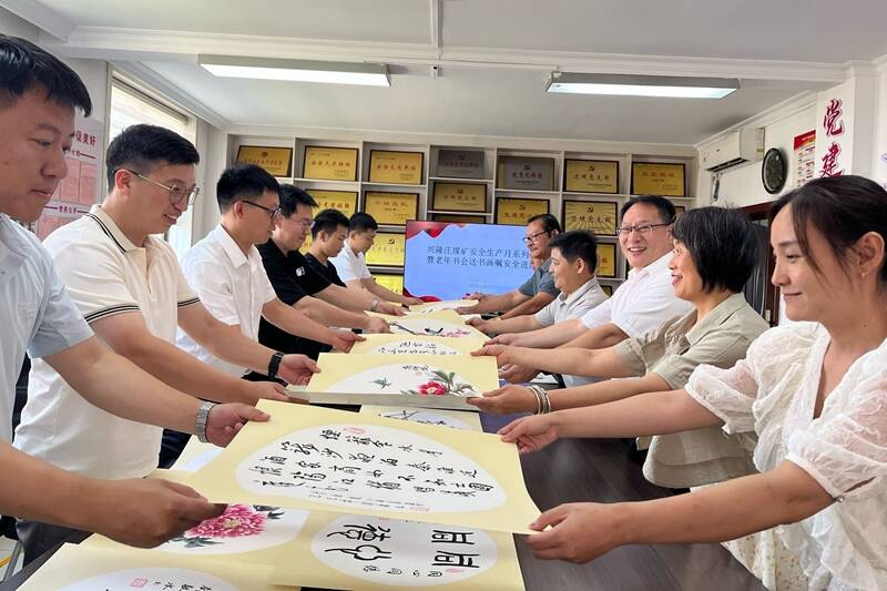 除了街头送安全,他们还把关怀送进区队。在兴隆庄煤矿老年书会送书画嘱安全活动现场,会议室里墨香四溢。老年书会的老同志们精心创作,山水、花鸟、书法作品铺满长桌,每一幅都饱含对一线职工的牵挂。