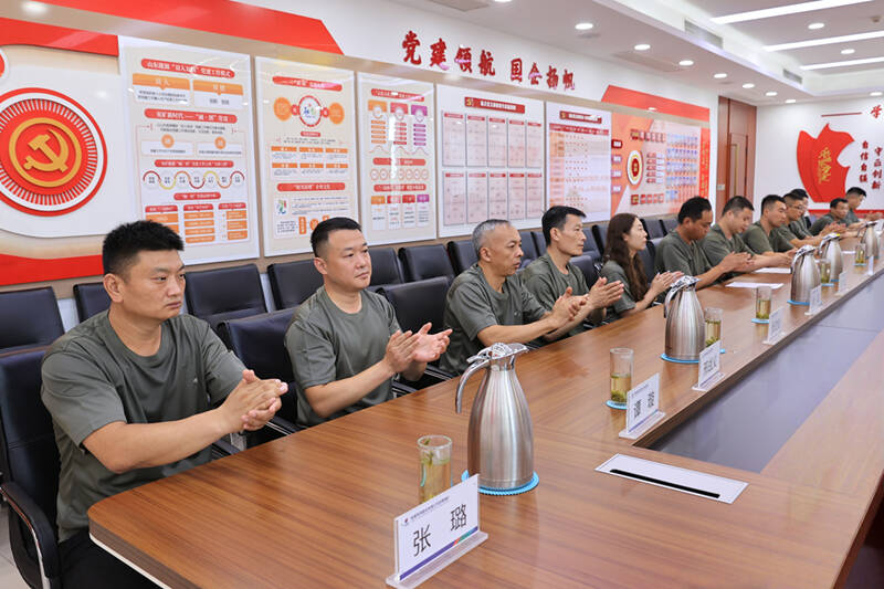 会上,来自不同岗位的退役军人代表分享了军旅故事与奋斗心声:普掘一区王帅深情回顾军旅生涯的锤炼,誓言在井下“战场”践行军人品格;综合服务中心张波通过参加民兵集训重燃热血,决心将“为人民服务”的信念融入班组管理;运搬工区李政达结合运输岗位实际,提出将军队纪律、责任、担当等特质转化为保障矿井安全的“执行力、洞察力、战斗力、凝聚力、专业力”;综采一区刘金錾发出“矿灯是新肩章,安全帽是新钢盔!‘保生产’就是新时代‘保家卫国’!”的豪迈宣言。现场气氛庄重而热烈。