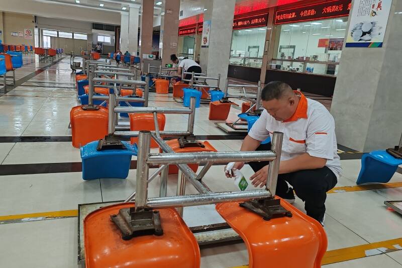 该矿坚持“全覆盖、无死角、高标准”的原则,制定详细的清洁消毒流程,利用专业清洁剂和工具,对55张餐桌椅进行了彻底清洗,擦拭去除桌面顽固油渍,彻底清除椅背与椅腿缝隙中的积尘,并对所有桌椅进行了严格的消毒处理。
