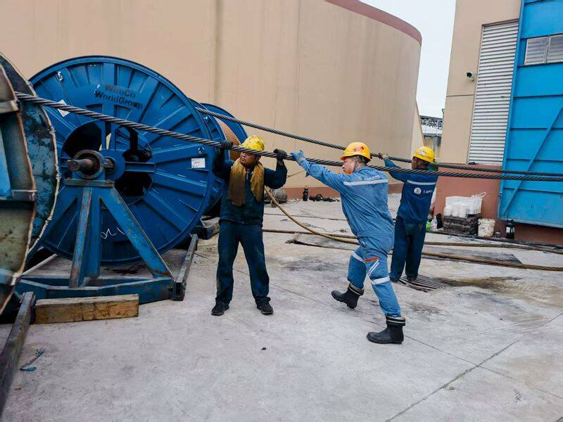 “空间不足就优化流程,传统工艺低效就创新方法!”面对现场痛点,分管领导带领团队果断摒弃“先拆后装”的传统模式,创新引入新工艺破解困局。团队采用钢丝绳穿孔护套,实现新旧钢丝绳的精准对接,其自带的旋转连接器装置,能有效避免钢丝绳旋转受力,从根源上防止滚筒、天轮绳衬等设备损坏,仅此一项便节约施工时间约2小时;同时,将原本需分步实施的拆卸、安装工序优化为同步推进,大幅压缩高空作业时长,降低交叉作业风险。相较于传统工艺,新工艺不仅缩短工期近2小时,更减轻了施工人员劳动强度,在空间受限的复杂条件下实现了“安全零事故、质量零缺陷”。