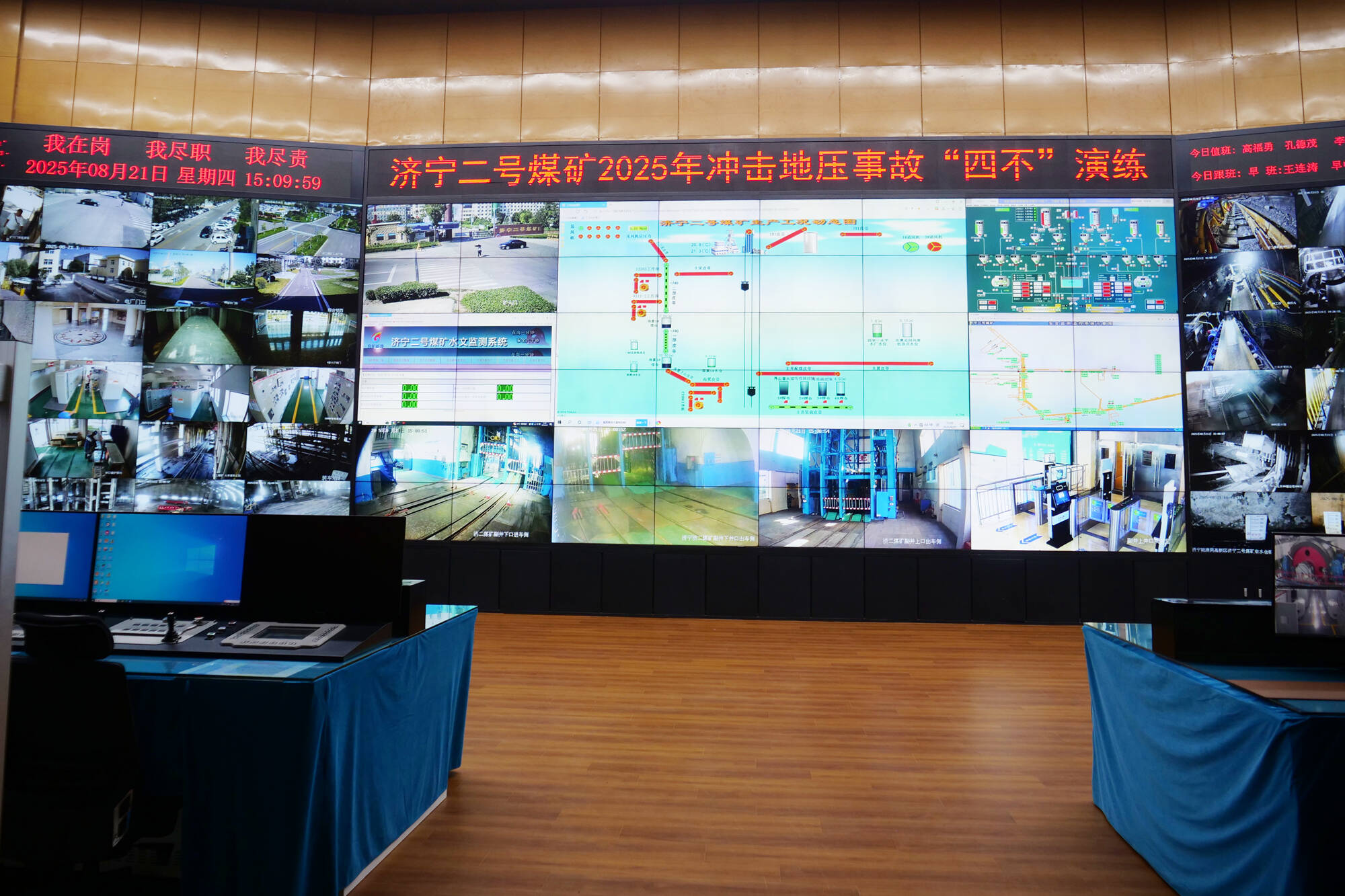此次演练模拟综采一区C33下04辅顺超前工作面40-60m处发生局部冲击地压事故,1名职工被困。事故发生后,现场作业人员迅速向调度信息中心汇报。值班调度员立即利用井下应急广播系统向事故影响区域下达停产撤人命令,同时向演练总指挥汇报。总指挥随即下达启动应急救援Ⅰ级响应的指令,成立应急救援指挥部,并通知救护一中队、医务所、安保项目部立即到矿救援。