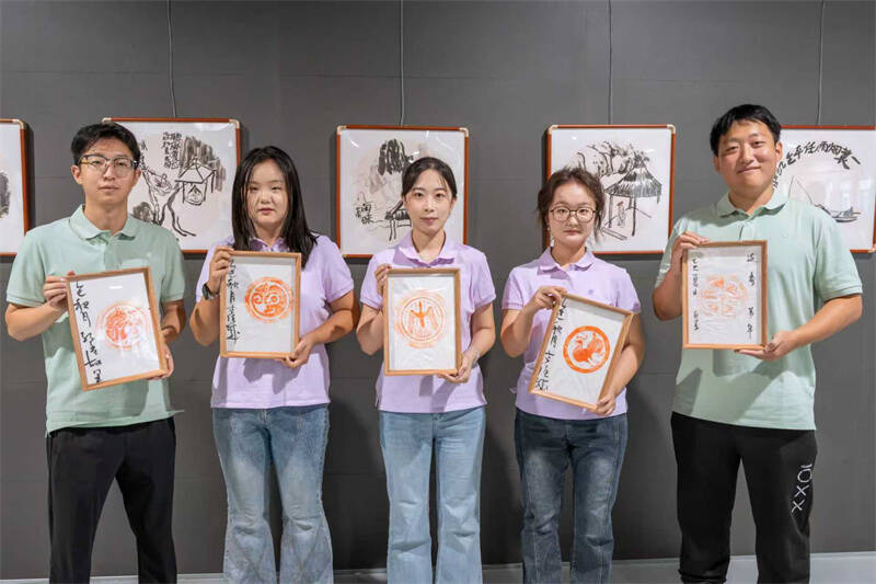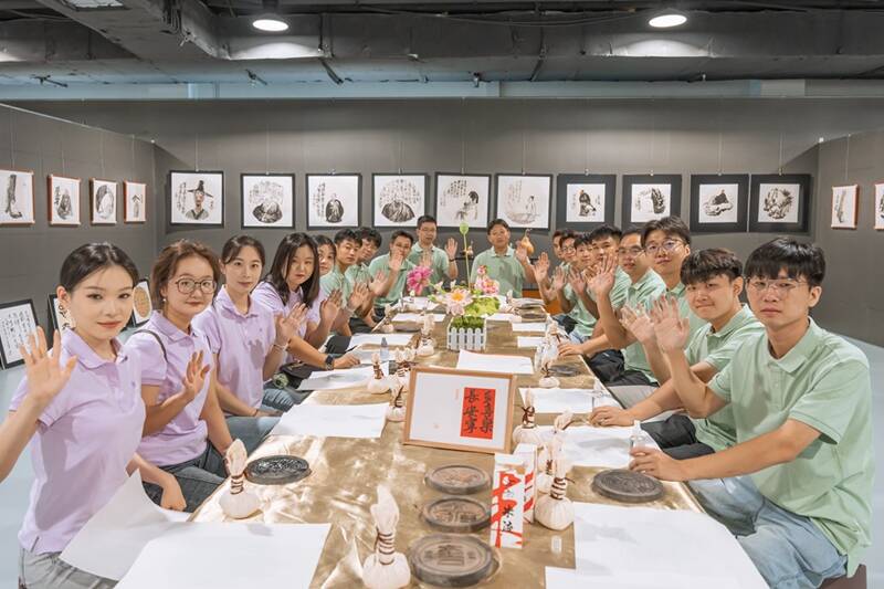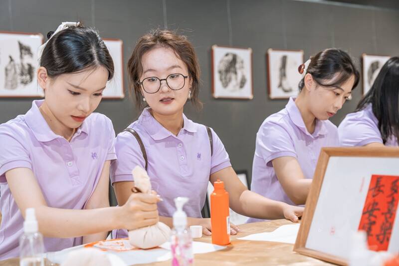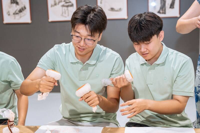 活动在轻松愉快的音乐声中拉开帷幕。第一个环节的传统技艺体验区顿时热闹起来,其中拓印体验区尤为引人注目。空气里弥漫着淡淡墨香,古朴的案台上整齐摆放着梨木雕刻的版片、柔软的拓包、宣纸以及浓淡相宜的墨汁。掘进工区李昱陶正小心翼翼地铺平宣纸,轻轻拍打墨包,当“平安喜乐”四个古朴的大字渐渐显现时,对面姑娘们惊喜的眼神让他露出了腼腆的笑容。“这是我第一次尝试拓印,比操作井下设备还要紧张呢!”他笑着说。