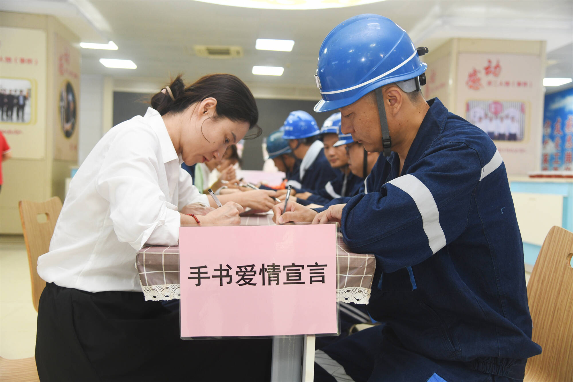 活动刚开场,“手写爱情宣言”就把气氛拉满。几对夫妻围坐一桌,笔尖在彩纸上沙沙作响。有人写下“下井别逞强,要注意安全”,有人画了个笑脸:“结婚18年,你护矿我护家,咱都平平安安”。