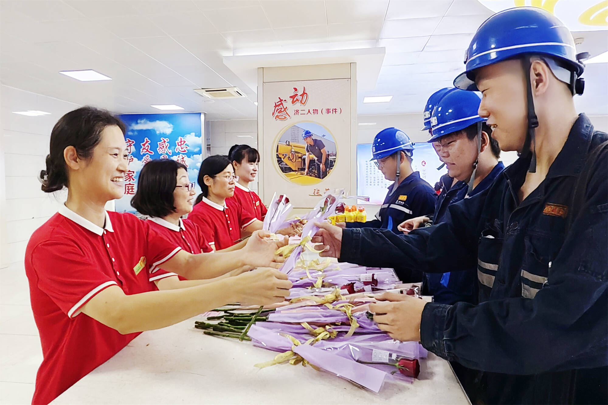 “把爱带回家”环节更贴心。上下井的矿工师傅们围在答题区,“井下作业前要做什么检查?”“‘四不伤害’指的是?”问题刚出,手就举成了一片。答对的矿工师傅接过女工协管员递的鲜花和生活用品,笑得合不拢嘴:“这下七夕能给老婆送花了,还能捎带些家用,真不错!”