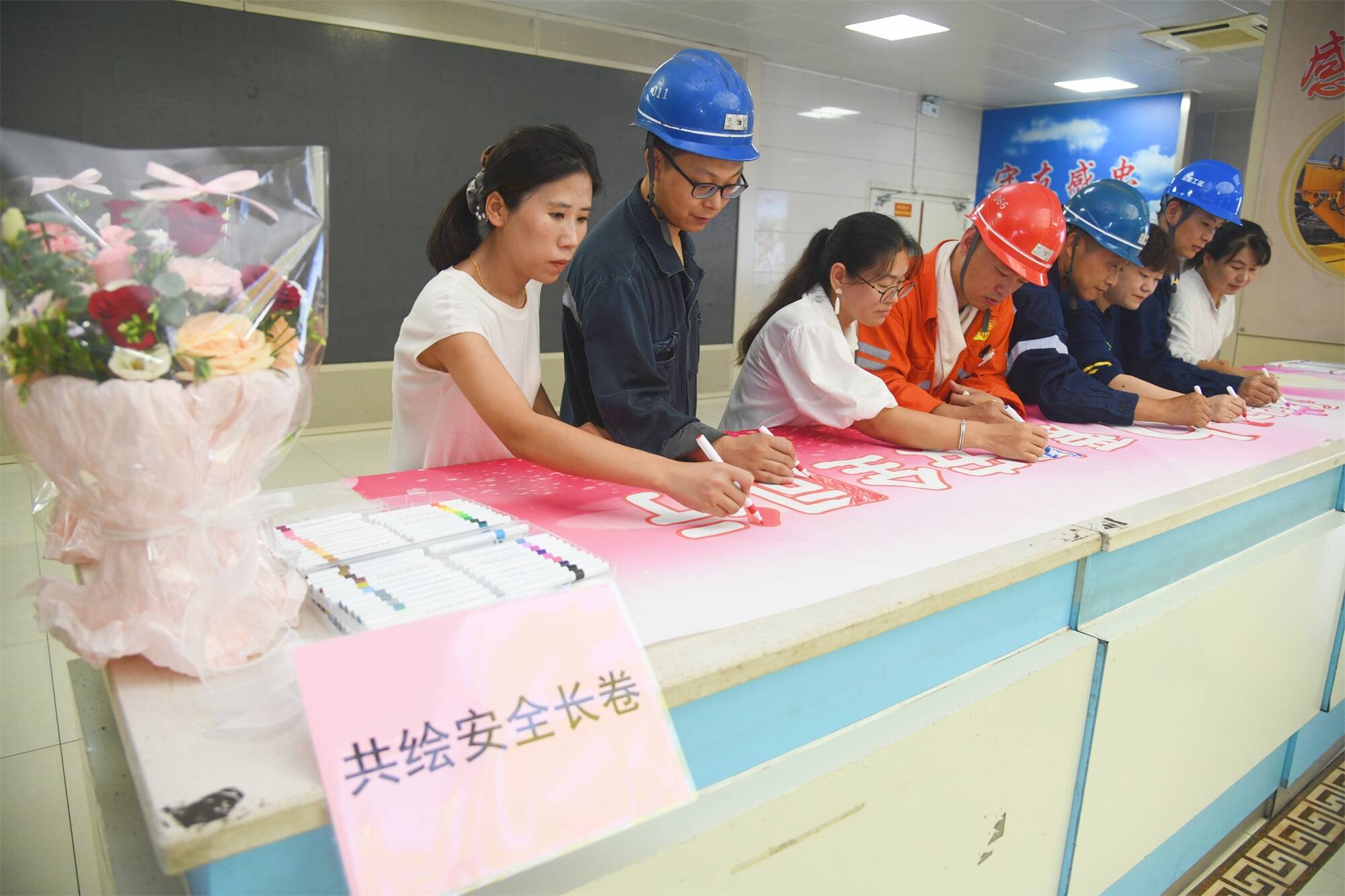 如果说表白是“小浪漫”,那“共绘安全长卷”就是“大约定”。长长的画布铺开,职工夫妻们和上下井的矿工师傅们凑到一起,你一笔我一画地忙碌起来。