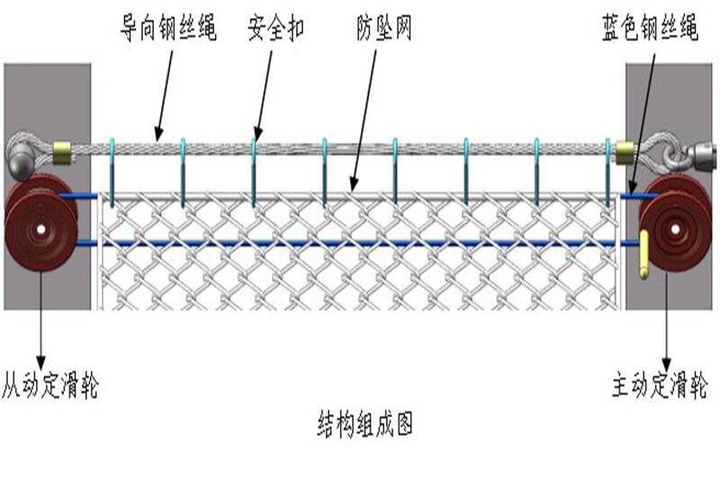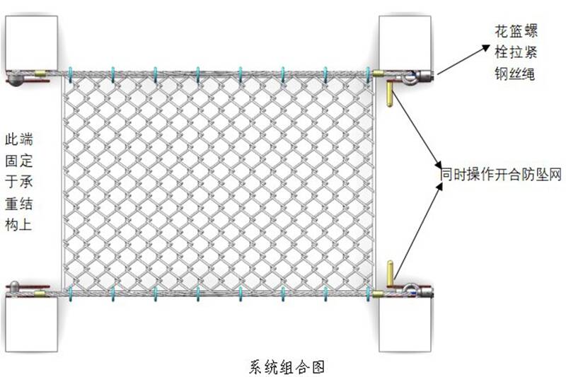 该系统结构设计巧妙,采用“一端固定、一端活动 + 中间钢丝绳导向”布局,活动端加装滑轮组,显著降低开合阻力;防坠网本身选用高强度耐磨材料,既保证优良承重能力,又具备良好柔韧性,即便受到意外冲击也不易破损。操作系统更是做到了“零门槛”:作业人员无需借助任何工具,只需轻拉活动端的牵引绳,数秒内即可完成防坠网的开启或闭合——吊装前“一拉即开”,保障物资畅通无阻;作业后“一放即闭”,防护状态瞬时恢复,真正实现“随用随开、用完即闭”,彻底消除了高空作业过程中的安全盲区。