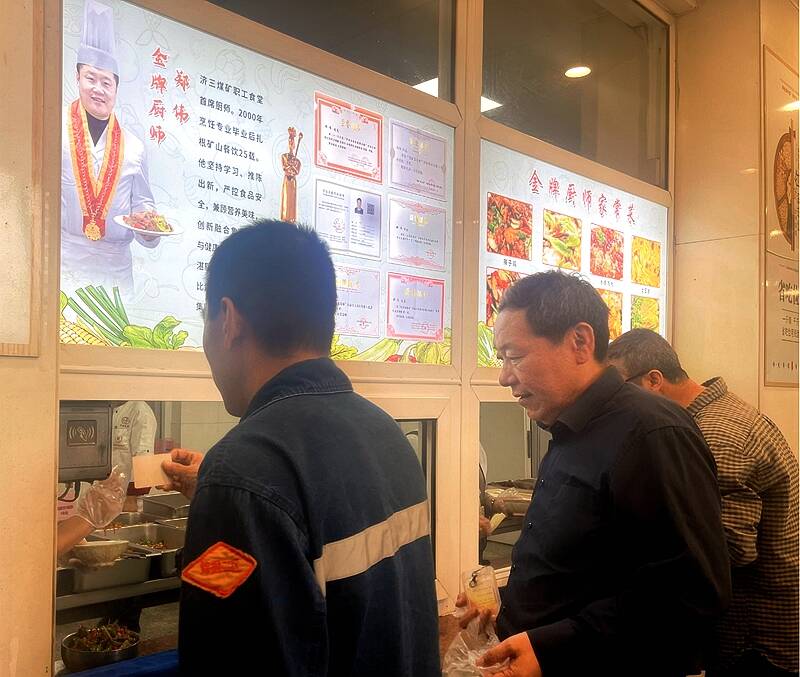 严规铁纪就是守护安全。“对新购入的茄子、青椒等蔬菜进行检测,符合我们的标准,准许入库。”为保证食材新鲜度和食材质量,验收核算岗点3名党员和责任区职工严格执行《中华人民共和国食品安全法》等法律法规,严把食品进货渠道,严格执行索证索票,健全供货台账。严格执行农药残留检测制度,由原来的半月一轮次检测提高到一周检测一轮次,杜绝农残超标食材入库入矿。严格执行班组长、仓库保管员“双验收制度”,杜绝腐烂变质、异味等不合格食材入库。米、面、油、肉等大宗入库食材做到离地、离墙存放,保持通风良好,先进先出、后进后出的顺序使用。严格执行“摘、洗、切、配、炒、卖”六环节把关制度,不定时对食材质量、食品卫生、主副食品种以及保管情况进行检查,出现食品安全责任倒查。公备碗筷洗刷严格按照“一洗、二刷、三冲、四消毒”的步骤进行,确保碗筷安全卫生。