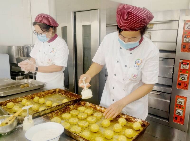 面案班增加南瓜高粱馒头、披萨、杂粮面包、荷叶枣卷等,手工制作出五仁、玫瑰鲜花、椒盐、黑芝麻等多种口味的月饼,尤其是椒盐月饼咸中带甜,甜而不腻,保证职工在节日期间都能吃到自制香甜月饼。