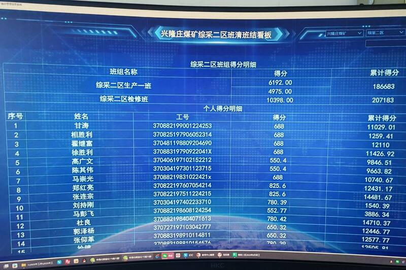 生产管理要精准,数据说话是关键。该工区针对采煤进尺、支护合格率、设备故障率等9项核心指标,建立了科学的“计价模型”——每推进1米进尺对应多少工分、支护合格率每提高1个百分点如何奖励、设备故障停机1小时扣减多少绩效,都有明确量化标准。更贴心的是,工区在会议室大屏幕上设置了班清班结可视化看板,当班的进尺量、合格率、故障次数等数据实时更新,红色数字提醒问题、绿色数字彰显成效,管理人员实时掌握生产动态,及时调整策略;职工当日就可知晓当班收入,一目了然。也能通过看板找差距、补短板,精准管理的“毛细血管”延伸到生产每一个环节。
