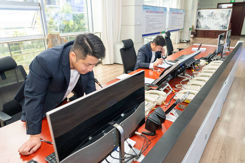 演练模拟北翼2#胶轮车巷迎头后20m顶板发生冒落,风筒被冒落的矸石砸落,无人员伤亡。现场施工人员立即停止作业,对设备进行停电闭锁,并汇报调度室。调度室接到汇报后,根据总指挥指令,立即启动顶板事故专项应急预案I级响应,利用井下语音广播下达撤人命令。同时,技术专家组、抢险救灾组、安全监督组、医疗救护组等10个工作组各司其职,分头开展工作。应急抢险人员迅速抵达现场,对顶板冒落区域进行顶板修复,修复完成后,演练圆满结束。