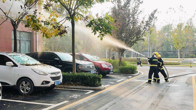 协同联动,各部门高效处置。“杨总,消防中控室报告15点半2#宿舍楼2层238室发现火情,兼职消防员正赶往现场扑救并引导疏散,应急广播已开启,请指示!”“启动应急响应,通知指挥部成员成立应急救援指挥部,按预案启动Ⅱ级应急响应!”杨总当即下达指令。调度室快速联动各相关部门。一连串指令通过电话、对讲机精准传达,各部门闻令而动,应急处置工作有序推进。2名消防员对准火情点位展开模拟喷射。