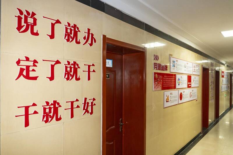 步入长廊,首先映入眼帘的就是“坚持党的领导、加强党的建设,是我国国有企业的光荣传统,是国有企业的‘根’和‘魂’,是我国国有企业的独特优势”。