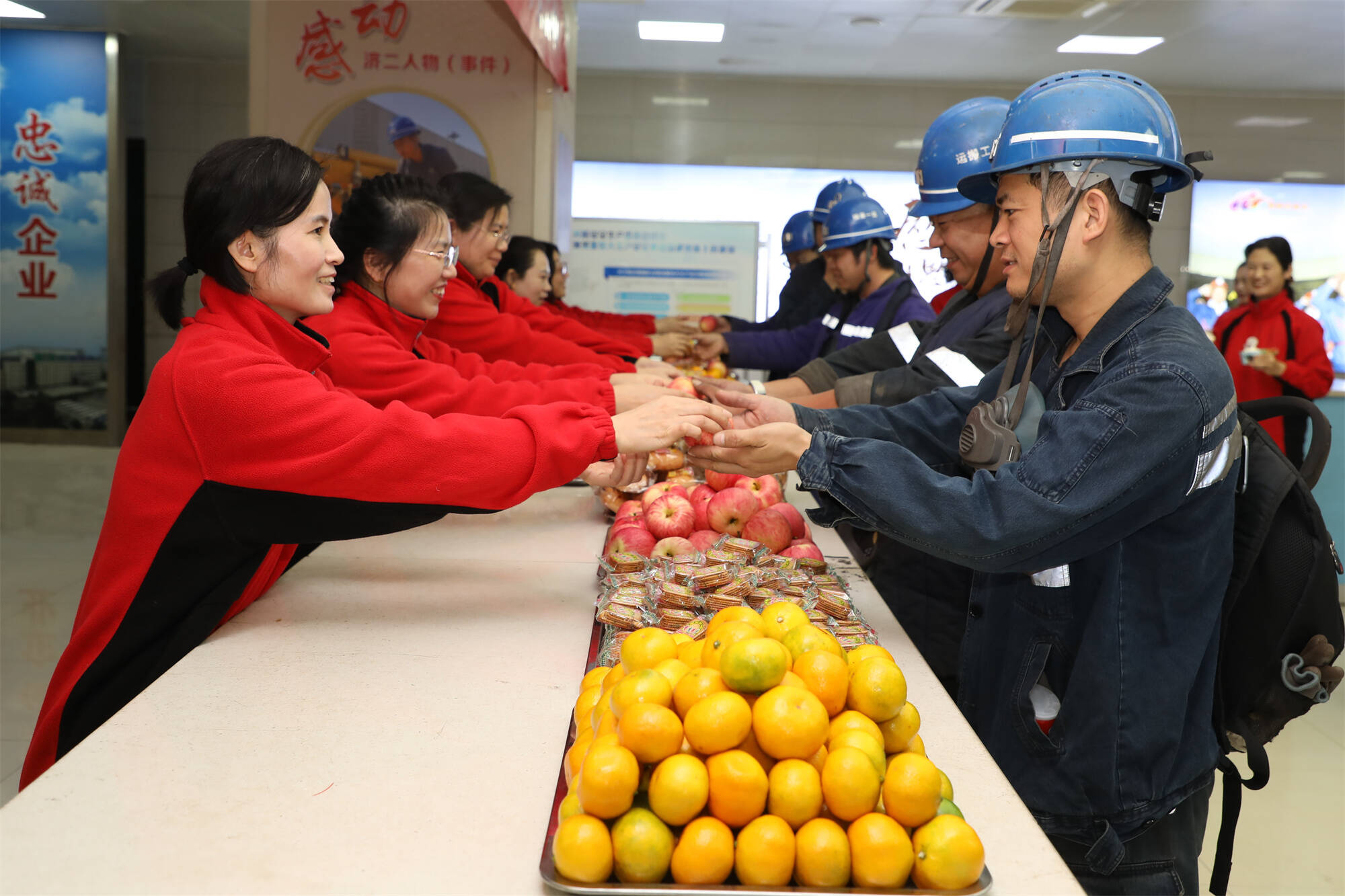 活动现场暖意融融,女工协管员们备好了“暖心亲情餐”,忙前忙后为上下井的职工递上精心准备的矿庆生日蛋糕、寓意“平安吉祥”的苹果、橘子及各类暖心零食。