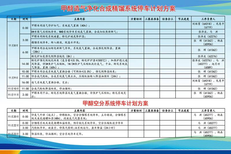 绘制“作战图”,实现停车精准受控。“凡事预则立,不预则废。”该车间制定精确到小时的“小时级”停车节点控制表,在中控室悬挂“停车计划作战图”,实施更新进度、实现进度可视化跟踪节点。在针对转化系统减量、合成系统停车等关键节点,严格执行票证管理和安全条件确认制度,确保“一步一确认、一环一把关”,让全过程处于受控状态,确保整个停车过程节奏可控、风险可控、质量可控。