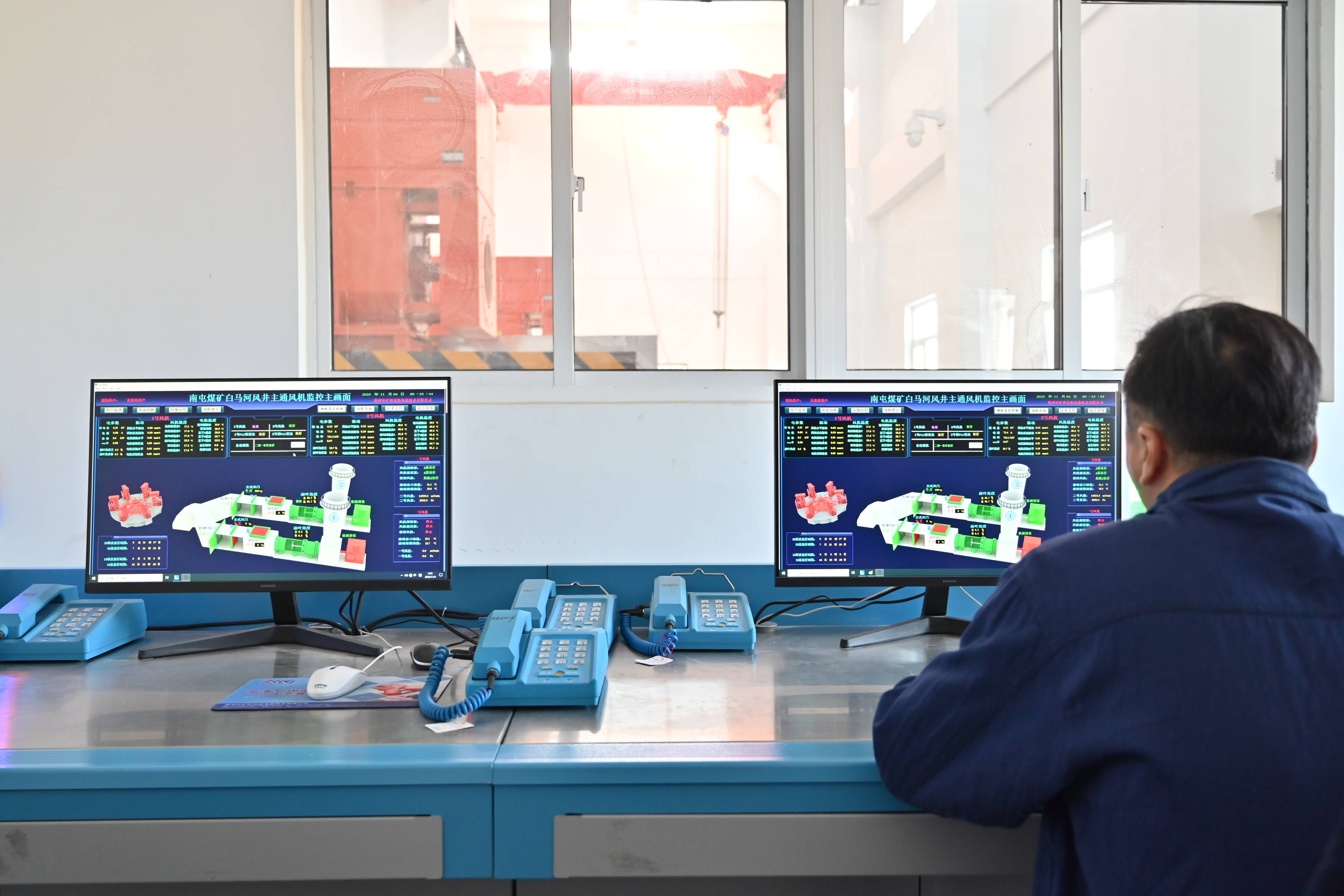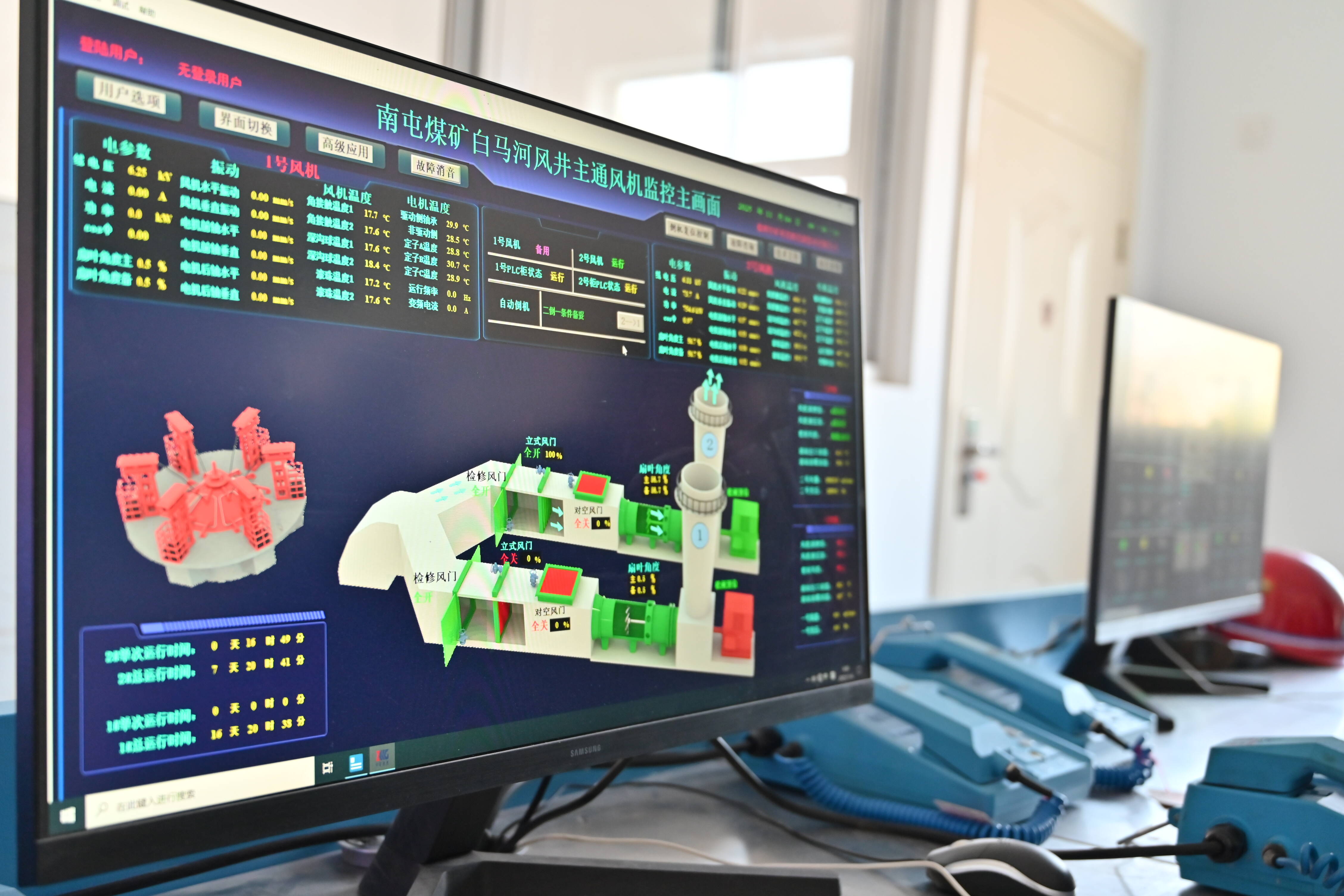 “2号柜PLC正常运行,井下立体风门全开,电参数、风机、电机温度全部正常!”随着一项项参数的正常运转,南屯煤矿白马河风井智能新主通风机正式投入使用。