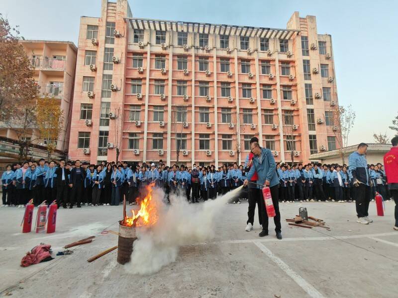 安全演练人人会,责任落实处处严。模拟教学楼因电器短路突发“火情”,值班人员迅速赶到现场,第一时间使用手提式灭火器进行初期扑救。伴随烟雾扩散,消防警报应声响起,迅速大声呼喊:“本楼发生火情,大家立即按照疏散指示,有序撤离至安全区域” 各楼层安全员立即就位,引导师生进入应急状态。在弥漫的(模拟)烟雾中,楼内全体师生反应迅速、临危不乱,用湿毛巾或衣袖捂住口鼻,低姿弯腰,沿着疏散指示标志,从最近的安全出口快速、有序撤离,整个过程紧张而有序,达到了预期目标。演练结束后,消防专业老师和学生门演示了使用干粉灭火器灭火的操作方法,并讲解了操作口诀要点:一提,二拔,三握,四压。在实战操作中,真正做到将理论强化于心,将技能熟练于行。