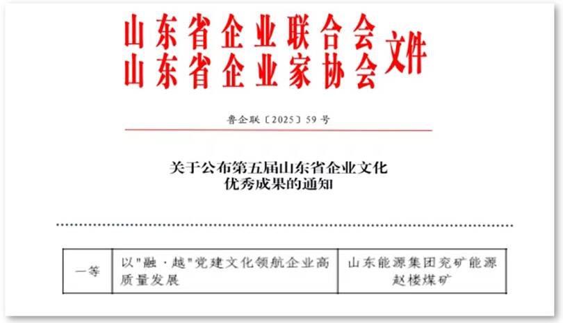 近日,从山东省企业文化优秀成果经验交流会上传来喜讯,赵楼煤矿报送的《以“融・越”党建文化领航企业高质量发展》文化案例凭借鲜明特色、创新实践与扎实成效,从众多参评成果中脱颖而出,荣膺一等奖。