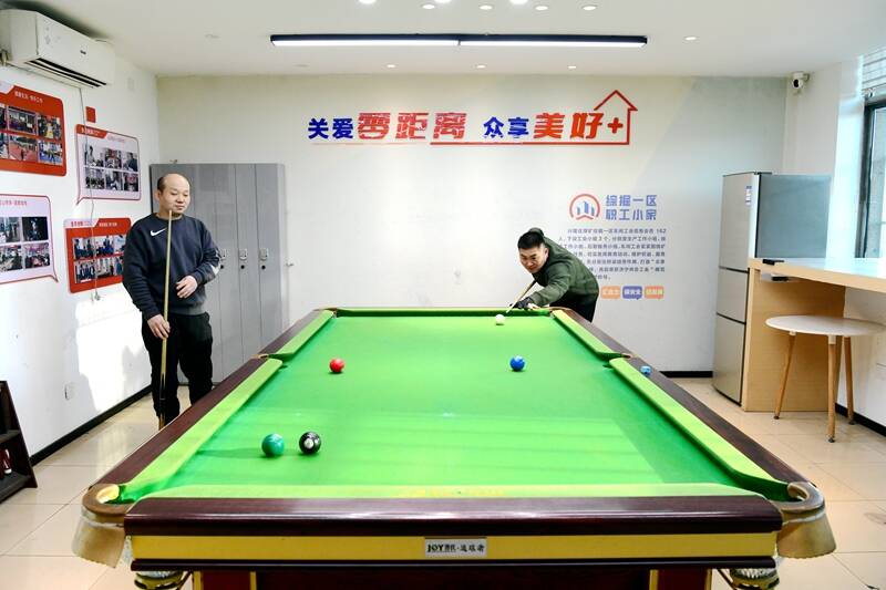 初冬时节,走进兴隆庄煤矿综掘一区“众享美好职工小家”,区队职工王康、张岩两位师傅正在进行一场台球比赛,只见他们俯身、瞄准、推杆、击球,认真对待每一次出杆,脸上露出开心地笑容……
