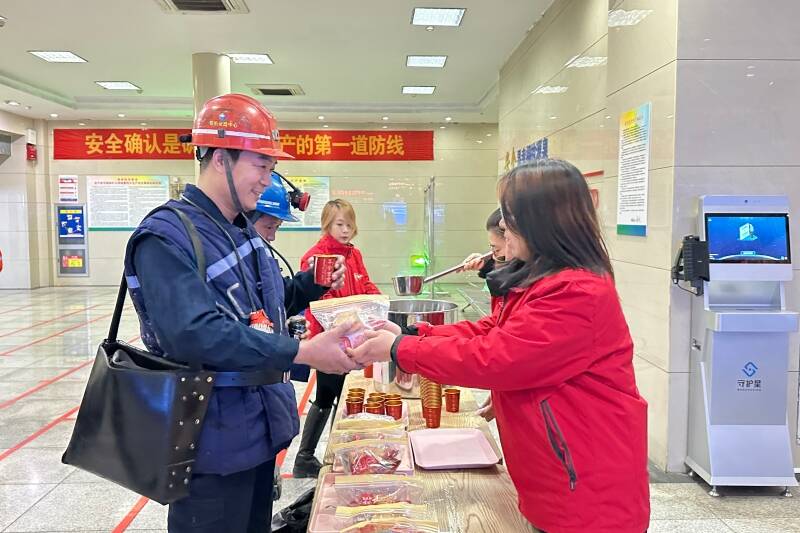 在该矿井口,志愿者们为来往上下井的一线职工贴心送上热气腾腾的姜茶,以及装有火腿肠、八宝粥、面包等物品的“暖心礼包”,并贴心提醒职工们注意保暖,勤洗手、常通风。