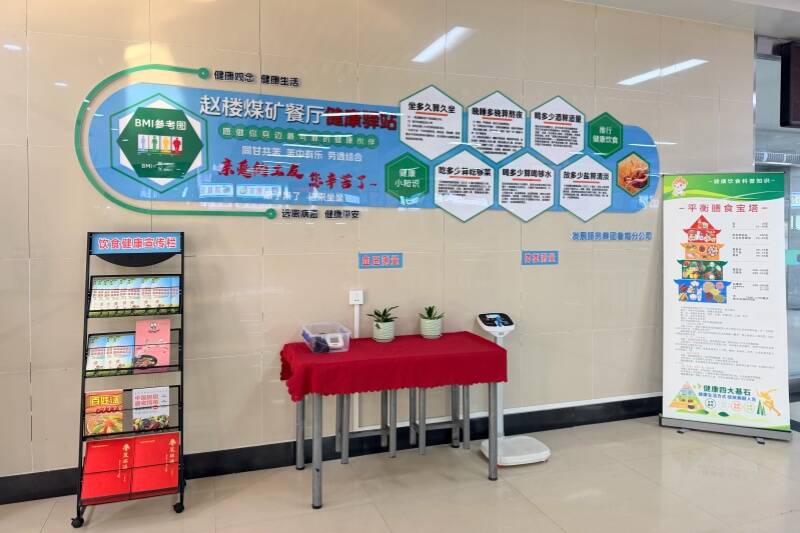 走进赵楼煤矿食堂,一处布置温馨的“餐厅健康驿站”映入眼帘。醒目的健康知识展架、便捷的体测设备、整齐的宣传资料,让小小的空间里满是暖心的细节。
