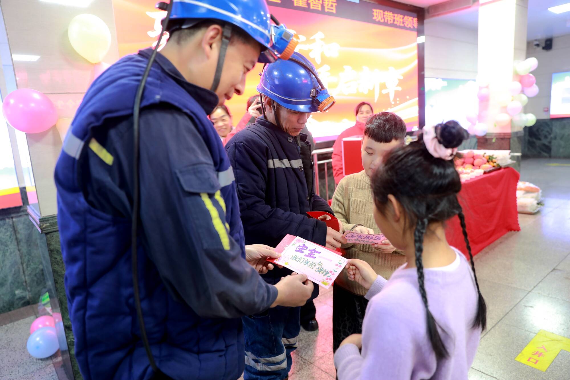 两位小朋友则为矿工叔叔们送上了自己亲手绘制的安全贺卡,贺卡上写满了孩子们稚嫩又真挚的寄语:“安全—我们永恒的旋律!”“愿叔叔们每天都平平安安回家,和家人团圆!”一句句暖心的话语,饱含着孩子们对矿工叔叔最深切的祝福。