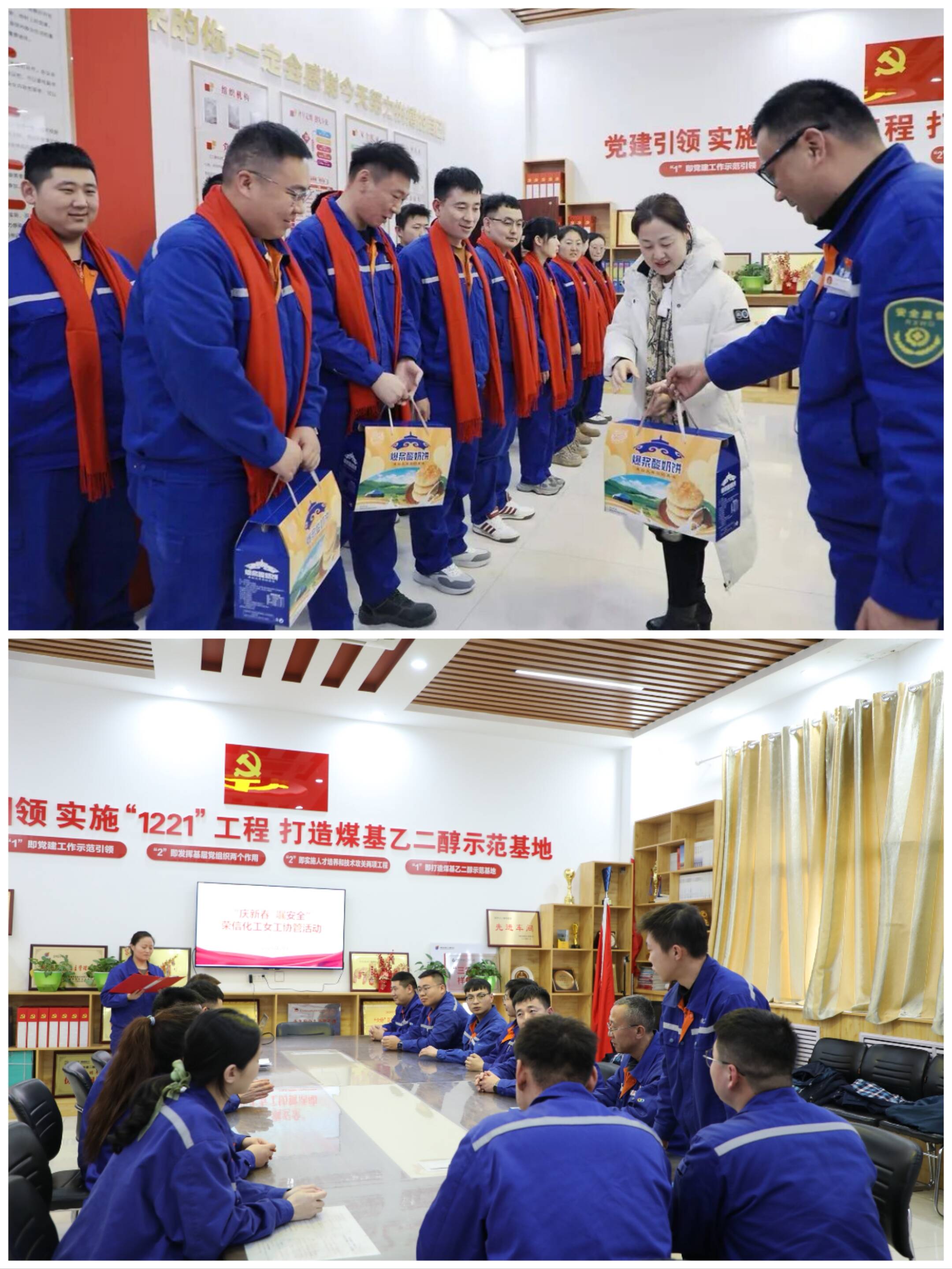 在石拉乌素煤矿综采工区班前会上,公司工会有关人员将满载企业关怀与新年祝福的“温暖大礼包”送到一线职工手中,并反复叮嘱大家“遵章作业、安全生产”。礼包中既有寓意吉祥的年货,还特别配备了智能颈椎按摩仪等十余种贴心实用的健康用品。与此同时,在荣信化工“庆新春、嘱安全”主题活动现场,工会有关人员把精心准备的内蒙古特色酸奶饼亲手递到每位职工手中,细致嘱咐他们坚守岗位、做好安全防护,并为大家一一佩戴上象征平安的红围巾。鲜红的围巾映衬着职工的笑容,现场暖意盎然,切实增强了职工“离家虽远,暖意长存”的归属感。