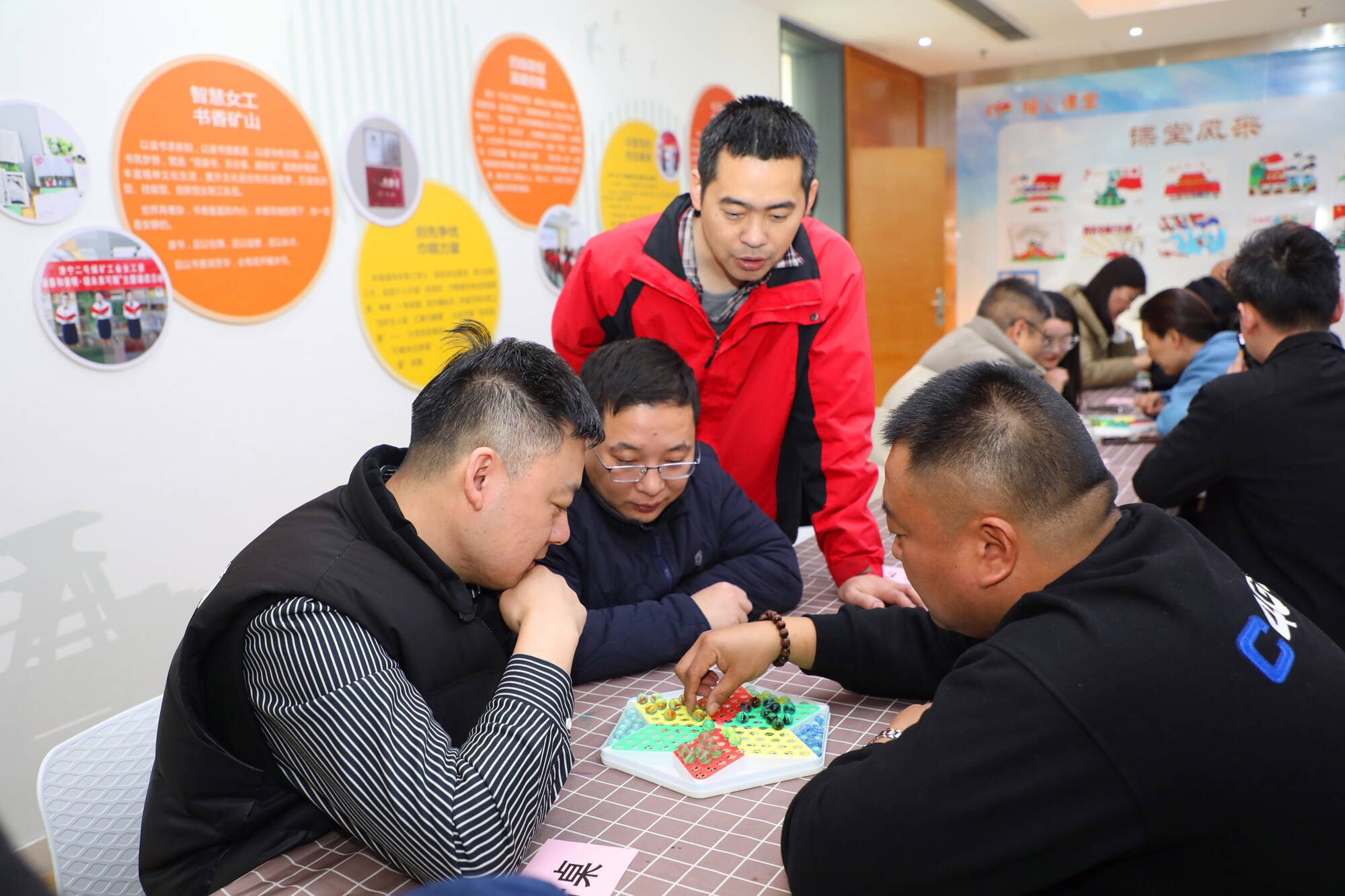 跳棋赛场同样乐趣满满、精彩纷呈。选手们凝神专注、运筹帷幄,紧盯棋盘、巧思布局,在跳跃的棋子间寻找最佳路径,或巧妙搭桥、或精准堵截,彼此你来我往、互不相让。灵动的棋子跳跃间,既有紧张激烈的趣味比拼,也有轻松融洽的互动交流,赛场之上始终洋溢着和谐愉悦、“棋”乐融融的浓厚氛围。