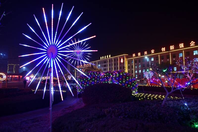在该矿调度信息中心广场前,一组“安全福”主题灯组格外醒目,“平安是福”“安全生产”的标语灯牌与漫天星灯交相辉映。“这些灯不仅好看,还藏着‘小心思’呢!”负责布置的小李介绍,灯组设计特意融入了安全理念,比如用闪烁的“安全帽”造型灯提醒职工时刻绷紧安全弦,用“全家福”照片灯箱传递“安全生产才能团圆过年”的温情。