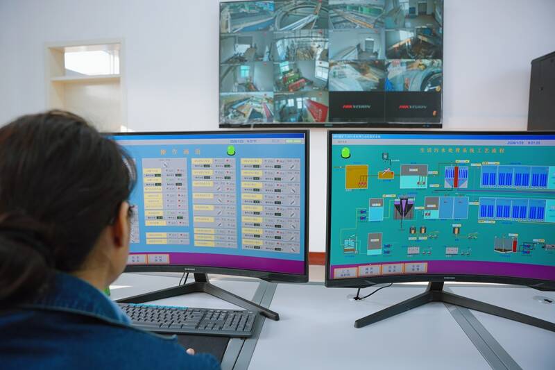 走进生活污水处理集控室,大屏幕上的工艺流程图、实时监控画面清晰直观,水位、水泵流量、溶解氧等各项运行参数实时跳动、一目了然。数据异常时,工作人员可通过系统实现自动化控制,快速处置、精准调控,让污水处理全过程更高效、更安全。