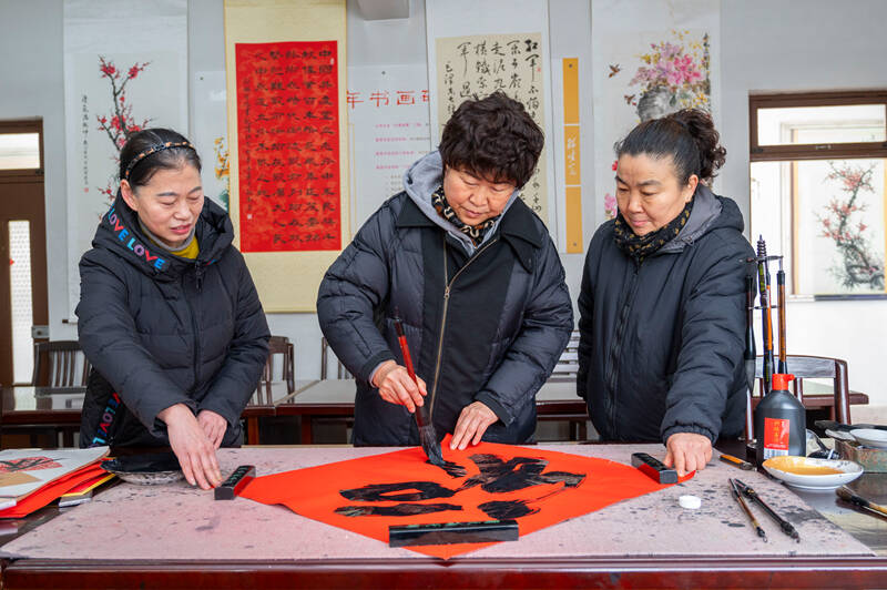 同一时间,老年书画研究会活动室里墨香正浓。会长李子平悬腕写下最后一幅春联,红纸洒金,字迹饱满。从腊月至今,他和三十余位老伙伴已书写春联、福字各一万两千余幅。