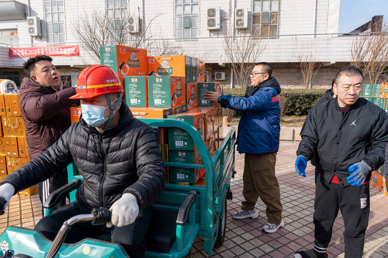 生产服务中心职工赵珊把花生油绑上电动车后座,弯腰又紧了紧绳子。“每年春节都有这份心意,今年这八样,家里都缺不了。”