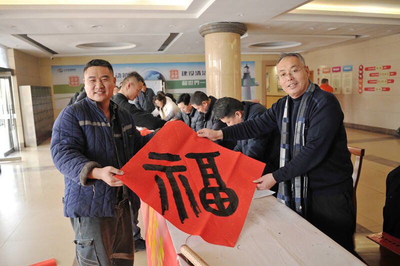 职工们争相挑选,有的拿着“福”字细细端详,有的和工友讨论对联寓意,还有的请书法师傅定制专属祝福,现场欢声笑语、暖意融融,处处洋溢着“家”的温馨与“年”的热闹。职工们捧着红彤彤的春联,脸上满是喜悦:“这春联不仅好看,还说到了咱煤矿人的心里,新一年跟着企业好好干,准能像咱矿的骏马(跨越雕塑)一样一往无前!”
