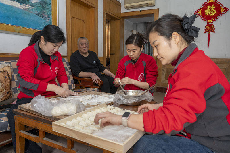 “知道您最爱吃芹菜肉水饺,我们特意带了新鲜的芹菜和猪肉,今天给您包水饺吃。”志愿者单晶晶的话语温暖贴心。择菜、洗菜、剁馅、和面、擀皮、包饺子,一系列动作娴熟流畅,屋内氤氲着食材的鲜香,也充满了家的暖意。赵德文老人坐在一旁,脸上满是笑意,不时伸手触摸身边的志愿者,轻声念叨着:“每年这个时候,你们都来陪我,有你们在,我心里比吃了饺子还暖。”
