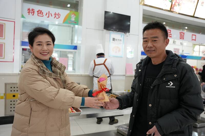 “春节快到了,食堂里挂着红灯笼,还有这么好看的面食玫瑰,既温馨又感动,心里暖洋洋的!”职工李鹏飞轻轻拿起一朵,爱不释手。