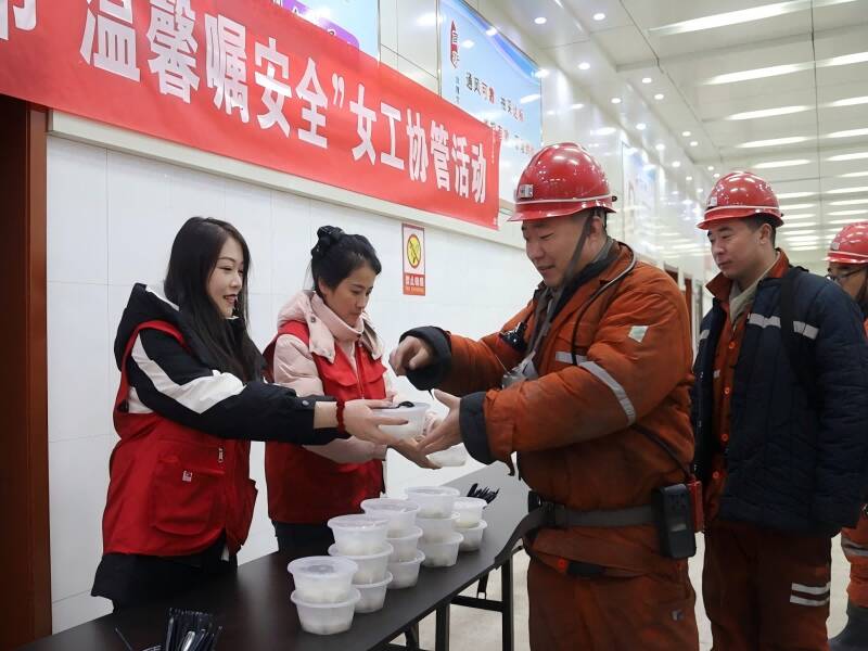 “师傅,您辛苦了!元宵节快乐!来吃碗元宵暖暖身子。”“下井作业可得注意安全,全家都盼着您平安归来呢!”随着上下井高峰的到来,女工协管员们将一碗碗热气腾腾、香气扑鼻的元宵递到矿工师傅们手中。