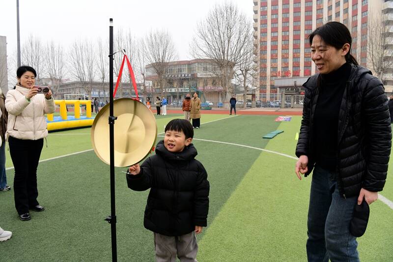 家庭赛的设置让节日氛围更添温情,趣味关卡成为参赛家庭亲子间的“默契试金石”。“手脚并用”中,需严格按照地面脚印、手印的方向指示通行,大人悉心引导、小孩认真模仿,小心翼翼的闯关引得现场笑声连连。“蒙眼敲锣”充满悬念,小朋友在家庭成员的耐心指挥下,避开障碍、辨别方向,每一次精准敲锣都能收获满场欢呼。