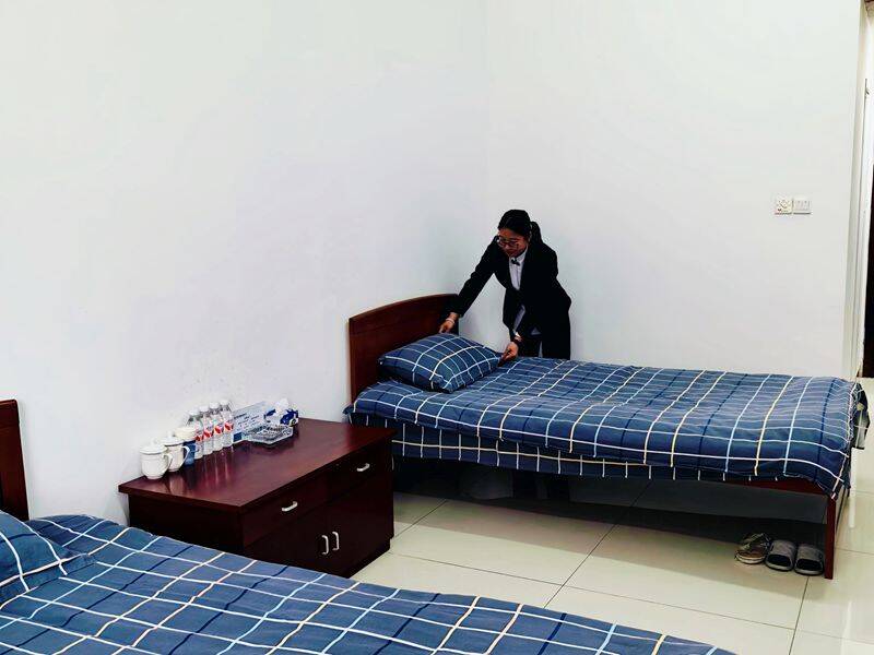 走进106公寓房间,保洁人员正忙着整理刚退房的宿舍,被褥拉得平整无褶皱,枕头摆放整齐划一,随后又仔细擦拭衣橱、清扫卫生间,不放过任何一个卫生死角,用细致的服务,为职工营造干净整洁的居住环境。