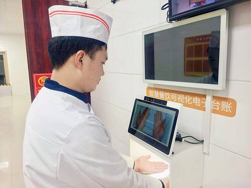 发服集团鲁南分公司万福餐厅厨师葛师傅双手轻扫晨检仪,屏幕上快速闪过体温、个人卫生、手部指甲及伤口检查的各项数据,全部合格后,他系紧围裙、戴上工帽,正式开启了一天忙碌而充实的工作。