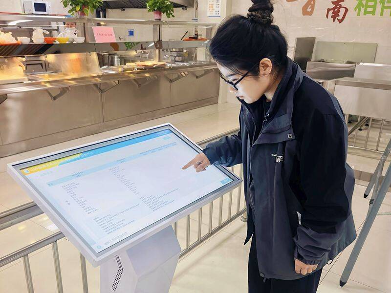 在一楼食堂大厅内,收款台东南角的智慧食安系统查询机前,万家乐便利超市职工小俊正认真查看当日菜谱,指尖在屏幕上轻轻滑动,纠结着是选一份低脂少油的减脂餐,还是来一个富含膳食纤维的粘豆包。“现在食堂的菜品越来越多样化,不仅能吃饱,还能吃好、吃健康,总能找到适合自己的口味。”小俊笑着说道。