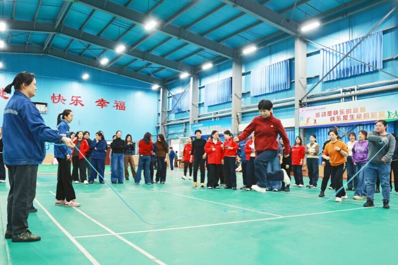 活动现场设置真人版俄罗斯方块大比拼、动力火车、跳大绳等趣味项目。在跳大绳现场,摇绳者节奏稳健,跳绳者轻盈跳跃,一次次连贯的跳跃,展现出女职工们的活力与风采。