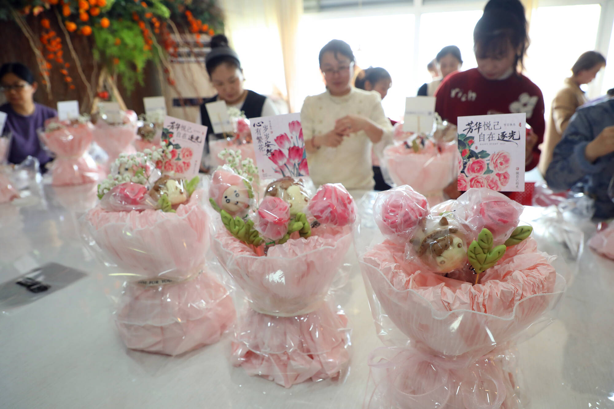 花馍蒸制完成后,大家将造型精巧的花馍组合成别致的花馍花束,并将寄语贺卡轻轻嵌入其中,手作之美与真挚心意融为一体,每一份作品都饱含着温暖祝福与浓浓心意。