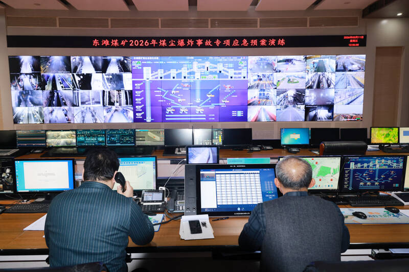 接到事故汇报后,值班调度员立即依照“紧急情况十项应急处置权”组织现场所有工作人员立即按避灾路线迅速撤离,并向调度室主任、值班领导、矿长、总工程师及带班领导汇报,启动《矿井煤尘爆炸专项应急预案》Ⅰ级应急响应。与此同时,东滩医院、驻矿救护中队、东滩安保项目部迅速行动,在井口拉设警戒,集结待命。随后,受伤人员被用担架安全护送升井。14:15分六采区人员全部撤离,安全升井,演练圆满结束。