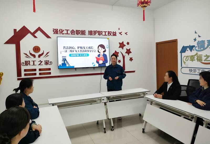 为打破“文件宣贯”的枯燥模式,济三煤矿工会组建“巾帼普法宣讲团”,带着权益保障宣传单,深入女职工集中岗位,利用工间休息等碎片化时间,开展“零距离微宣讲”。