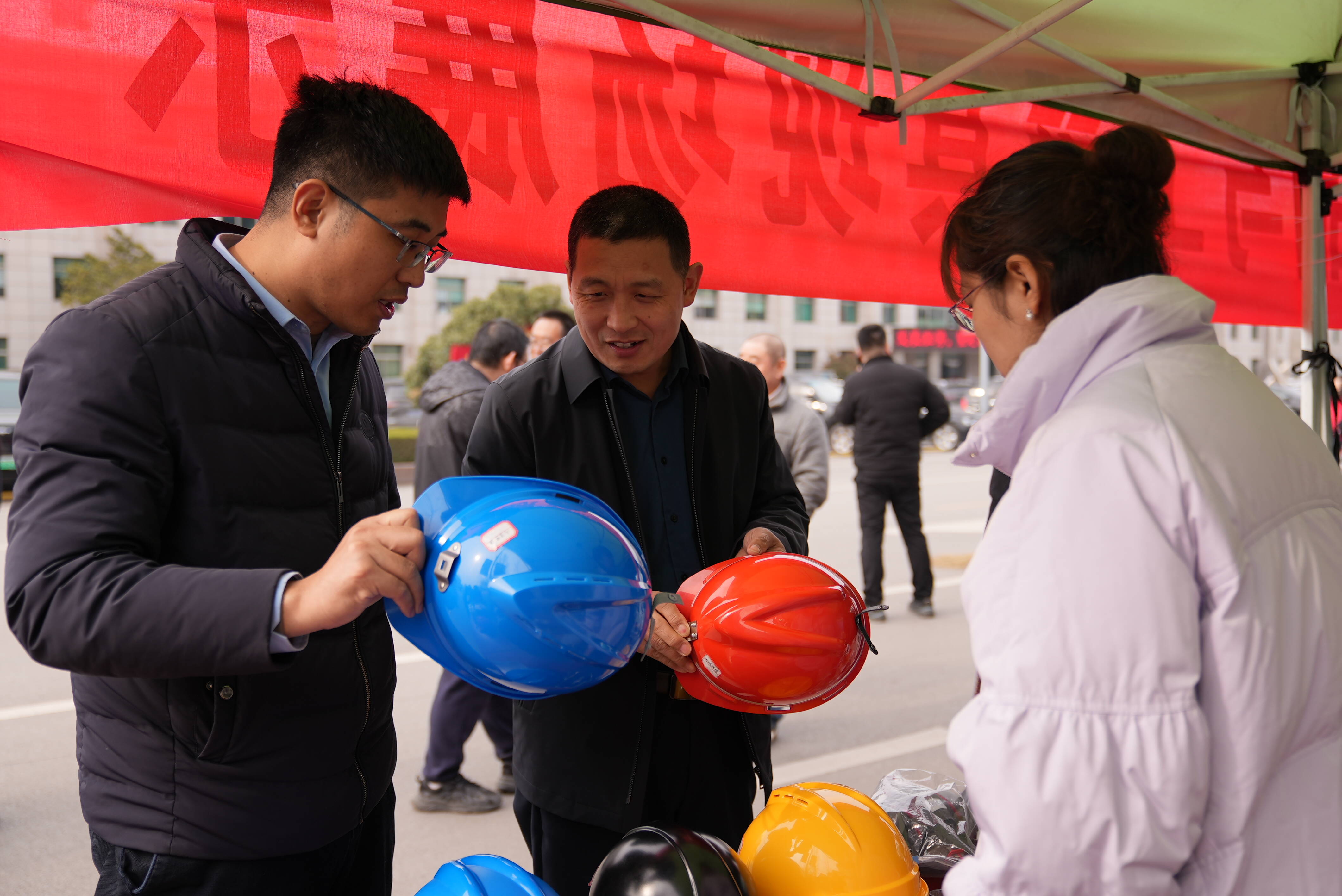 “这帽子的帽衬能调节,您戴久了不勒太阳穴。”另一侧,技术员小刘接过一顶红色安全帽,反复试戴后连连点头:“这个好,戴着透气,能不能多进几种颜色?咱们队里好区分。”