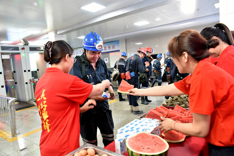 井口“爱心服务岗”常年不打烊,寒冬里送上热姜茶、暖手宝,酷暑里备好绿豆汤、清凉油,节日里端上饺子、月饼和平安果;矿工们的工装磨破了、扣子掉了,她们穿针引线细心缝补,让职工穿着整洁合身的工装安心上岗;升级服务站配置,配齐急救药箱、心理咨询台等,让职工在升井入井间隙休憩解压,筑牢心理安全防线。