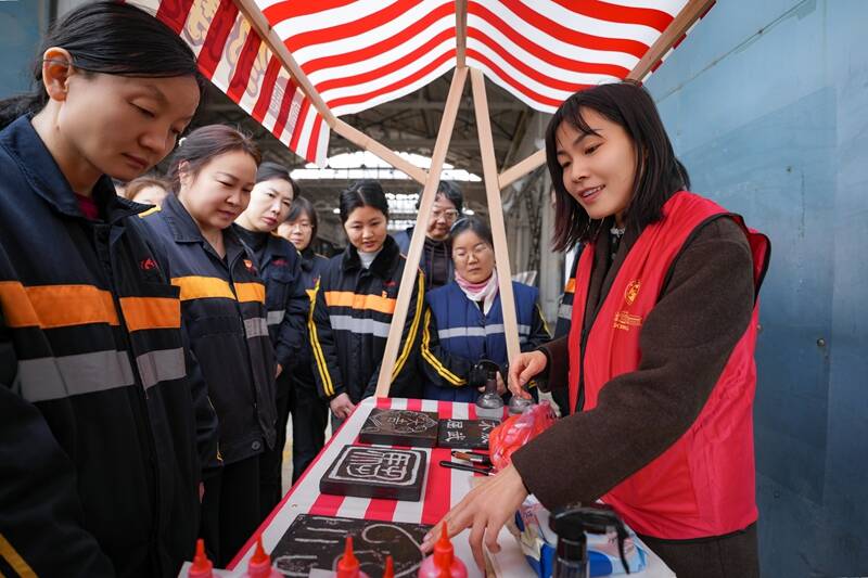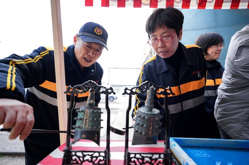 在互动体验环节,职工们积极参与拓印、丝网印刷和编钟敲击等传统技艺体验项目,大家以工作中的严谨态度专注操作、相互交流,认真完成每一道工序,在实践中感受传统技艺所蕴含的细致与耐心。