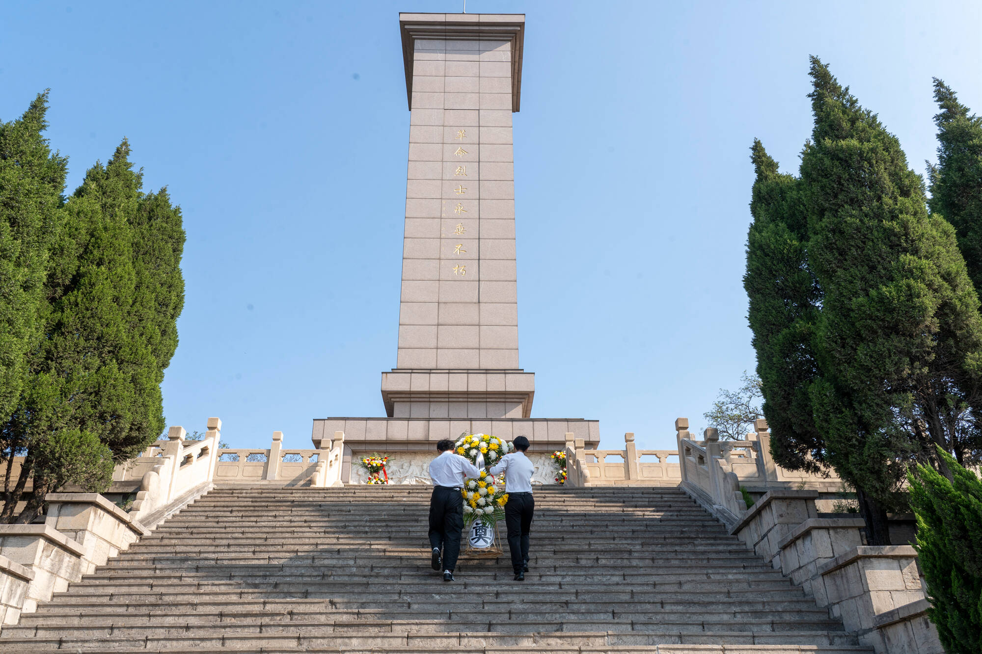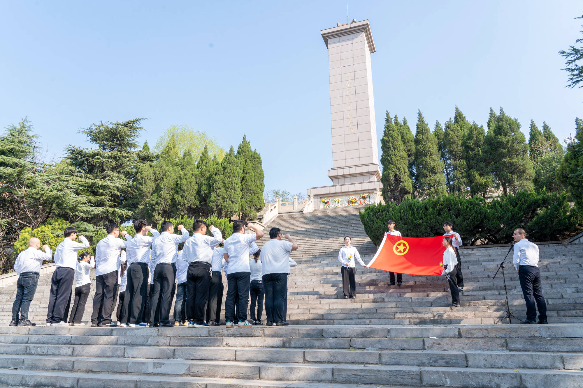 烈士陵园广场庄严肃穆,青年们怀着无比崇敬的心情,整齐列队于革命烈士纪念碑前,低头默哀、敬献花圈,向为民族独立、人民解放英勇献身的革命先烈致以深切哀思,并在纪念碑前重温入团誓词。