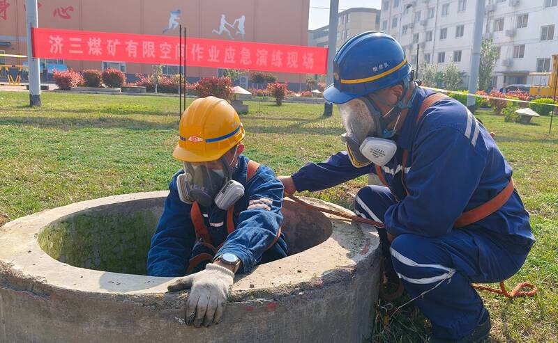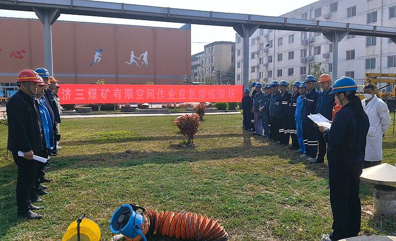 “高盐水处理站浓盐水池内施工人员徐某突发头晕,无法自主活动,请紧急救援!”4月3日上午9时30分,济三煤矿有限空间作业应急演练正式拉开序幕。