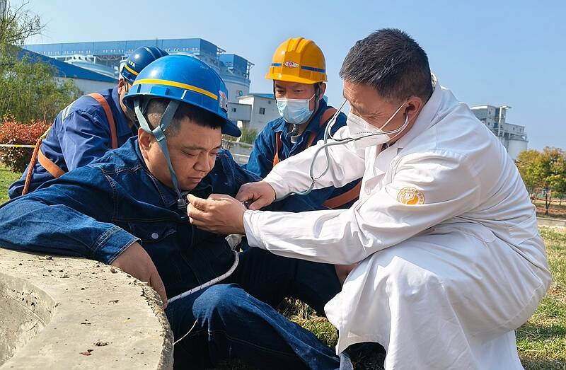 9时39分,使用气体检测仪对浓盐水池内有毒有害气体的浓度和氧气含量进行检测,确定氧气含量高于19.5%,符合安全救援标准。两名应急救援人员迅速进入浓盐水池进行人员施救,与地面监护人员通过对讲机实时沟通。9时45分,“被困人员”徐某被成功施救至地面通风处。早已等候在旁的医护人员立即上前,对其进行紧急救护,随后将其转送医院。