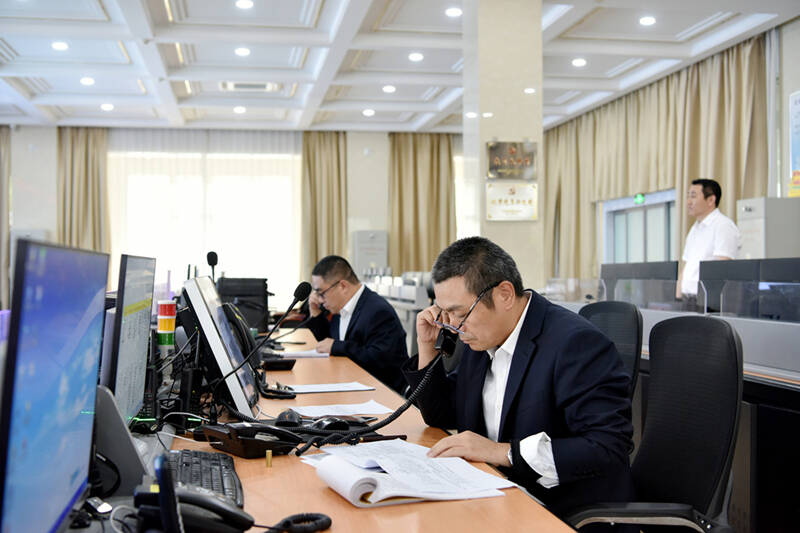 13时30分,演练正式开始。事故发生后,跟班人员立即向矿调度室汇报,调度员立即通知充填工作面受水害威胁区域所有作业人员迅速撤离。该矿立即启动Ⅰ级应急响应,成立应急救援指挥部,下设10个应急救援专业组,大家各司其职、立刻开展应急救援任务。同时,驻矿救护中队根据指挥部命令,立即赶往事故现场进行救援,兖州兴隆庄医院医护人员赶到副井上井口待命。15时30分,现场水位下降,状态可控,1名被困人员安全升井,演练圆满结束。